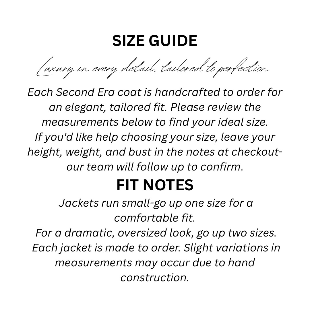 Each jacket is handcrafted to order, so we can’t provide photos before production. However, we can share images of previous pieces in your chosen style and color. Once your jacket is complete, we’ll send photos and a short video before shipping.